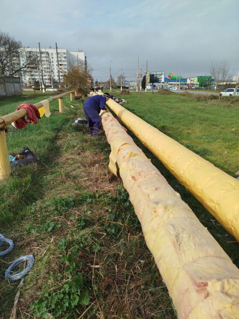 Сотрудники ГУП РК «Крымтеплокоммунэнерго» утепляют теплотрассу ДУ 325 мм идущую от котельной расположенной на ул. Свердлова, 57 в г. Керчь.